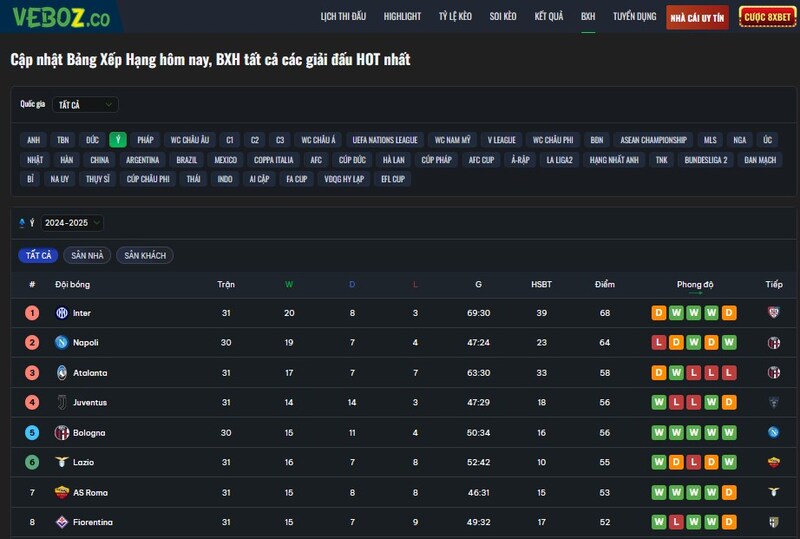 - Bảng xếp hạng: Tại Vebo TV, bạn có thể theo dõi bảng xếp hạng bóng đá Ý và các giải đấu khác một cách dễ dàng. Thông tin về thành tích của các đội bóng, đội nào đang dẫn đầu, đội nào cần cải thiện phong độ luôn được cập nhật kịp thời.